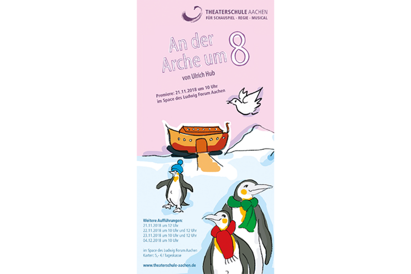Die Sintflut bzw. die Arche Noah sind Motive, die in vielen Weltreligionen eine besondere Rolle spielen. In Zeiten von kenternden Flüchtlingsbooten und dem Ruf nach Obergrenzen liegt in dieser uralten Geschichte eine erstaunliche wenn nicht sogar erschreckende Aktualität. Der Schriftsteller Thomas Hub hat in seinem Kinderbuch „An der Arche um 8“ diese Themen auf kindgerechte und humorvolle Weise umgesetzt und lässt neben Noah drei Pinguine und eine Taube zu Wort kommen. Der religiöse Hintergrund wird zwar nicht ausgeblendet, aber auch nicht mit dem erhobenen Zeigefinger vorgetragen. Roman Kohnle hat das Stück mit Studierenden der Theaterschule Aachen inszeniert, und am 21. November ist im Space des Ludwig Forums Premiere. In der Probenphase konnte Radio @m Alex ein ausführliches Interview mit dem Regisseur führen.